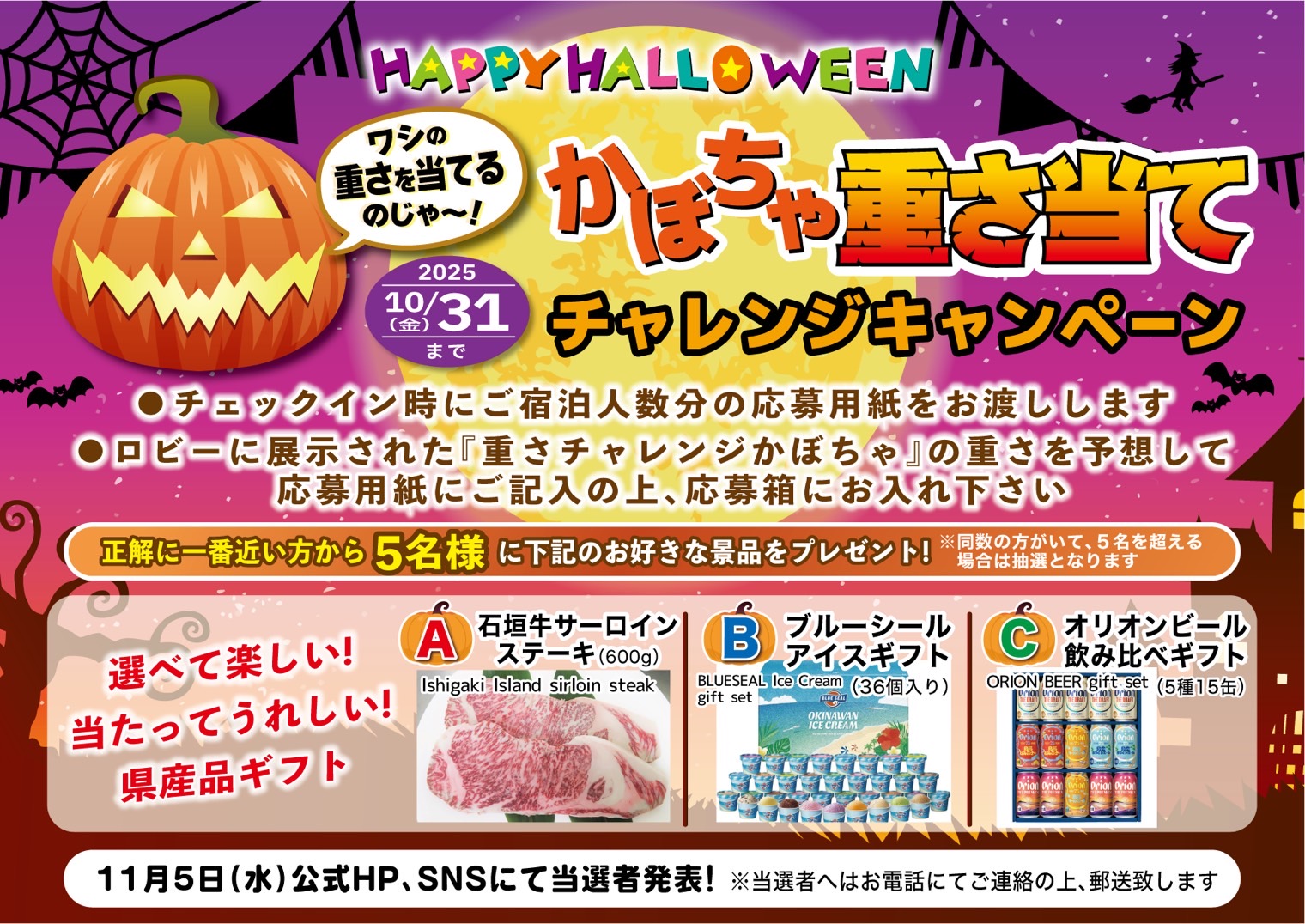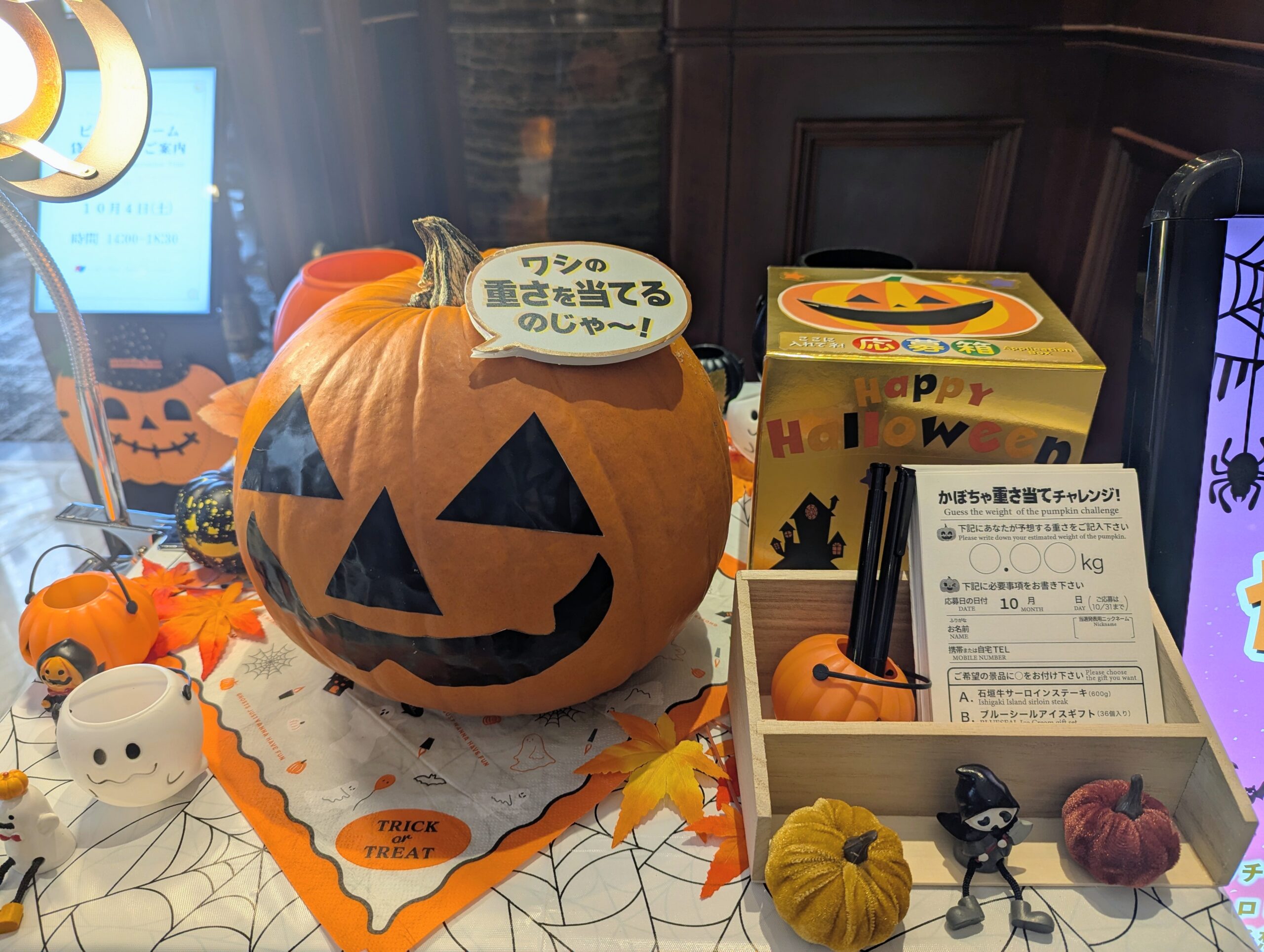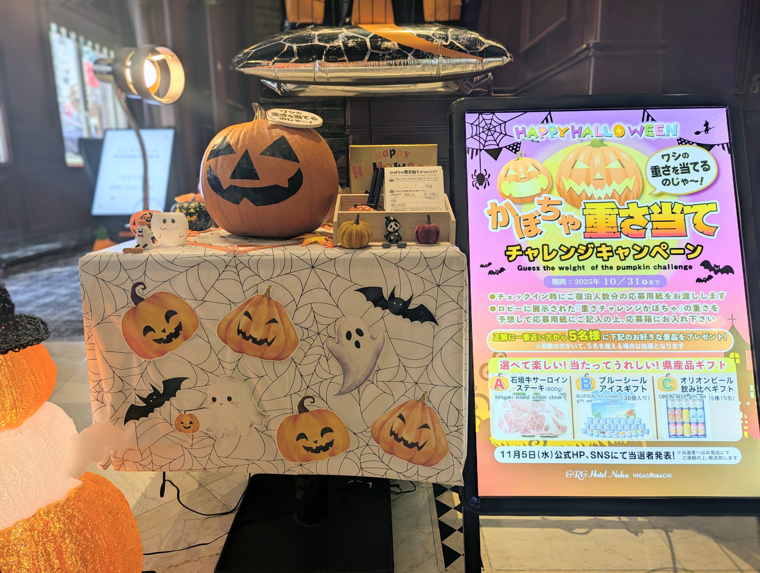 ご宿泊者限定♪フロント横にあるジャック・オー・ランタンの重さを当てて、豪華な沖縄県産品ギフトをゲットしませんか?正解に一番近い5名様に抽選でプレゼント!